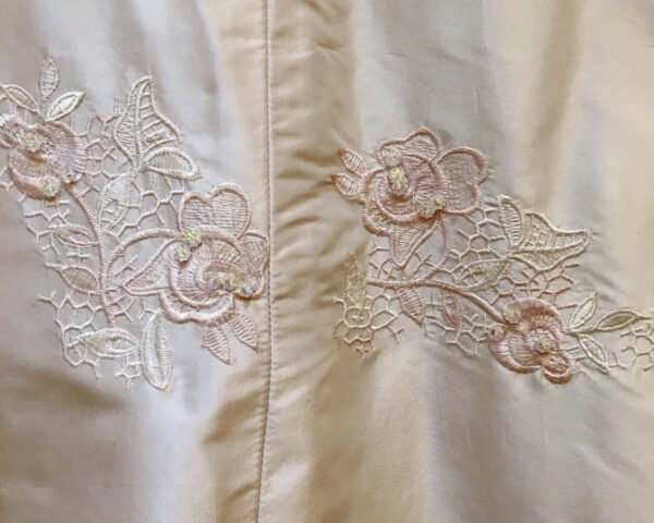 Part of our vintage silk collection Clover is a blush pink corset bodice with scallop edging top and bottom. There are dainty shoestring straps and the back of the bodice fastens with a zipper. Skirt is a princess A – line with a small chapel train. Bodice and skirt have dainty flower embroidery and beading embellishments. Size is uk 12.