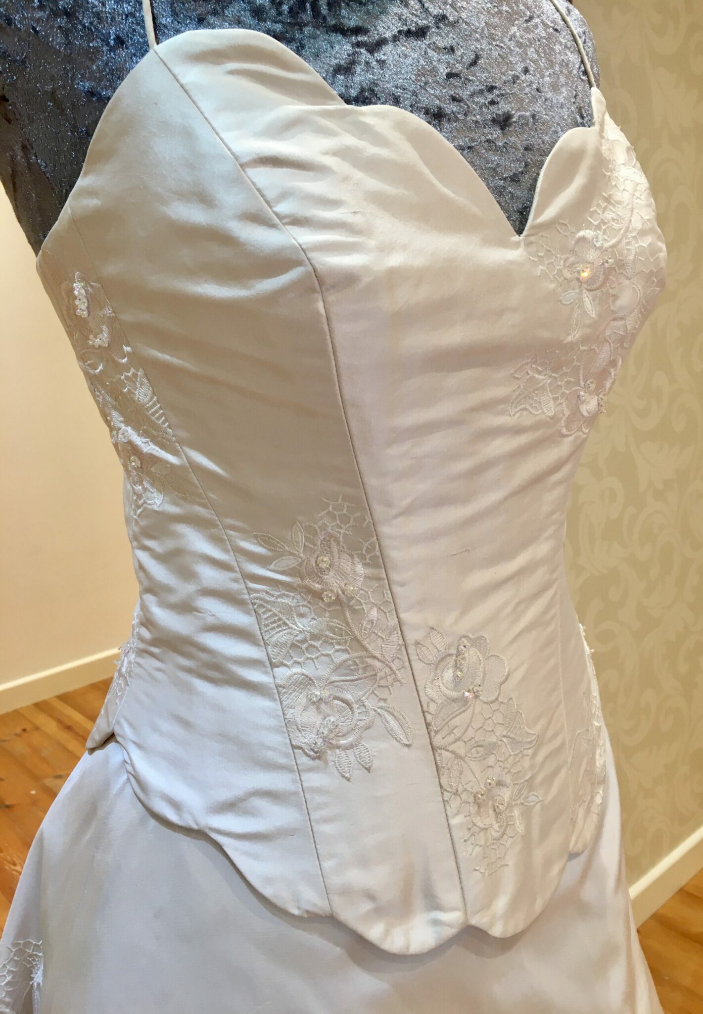 Part of our vintage silk collection Clover is a blush pink corset bodice with scallop edging top and bottom. back fastens with a zipper. Skirt is a princess A – line with a small chapel train. Bodice and skirt have dainty flower embroidery and beading embellishments. Size is uk 12. Please contact us for more information and to book your appointment