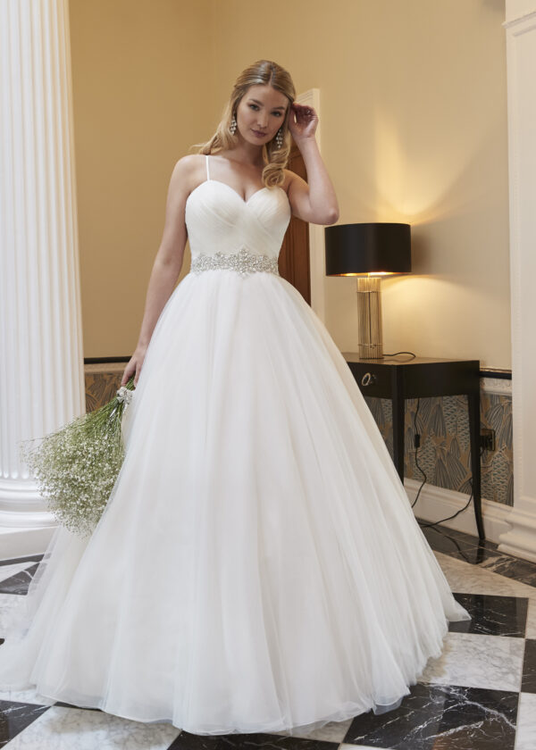 Macie is a romantic ball gown made from delicate Tulle which gives the gown an ethereal feel and is lovely and light. It features a delicately pleated sweetheart bodice and spaghetti straps. The waistline is trimmed with the most beautiful sparkly diamanté’ trim which is oh so flattering. The back of the dress is finished with tiny tailored buttons over a zip fastener.