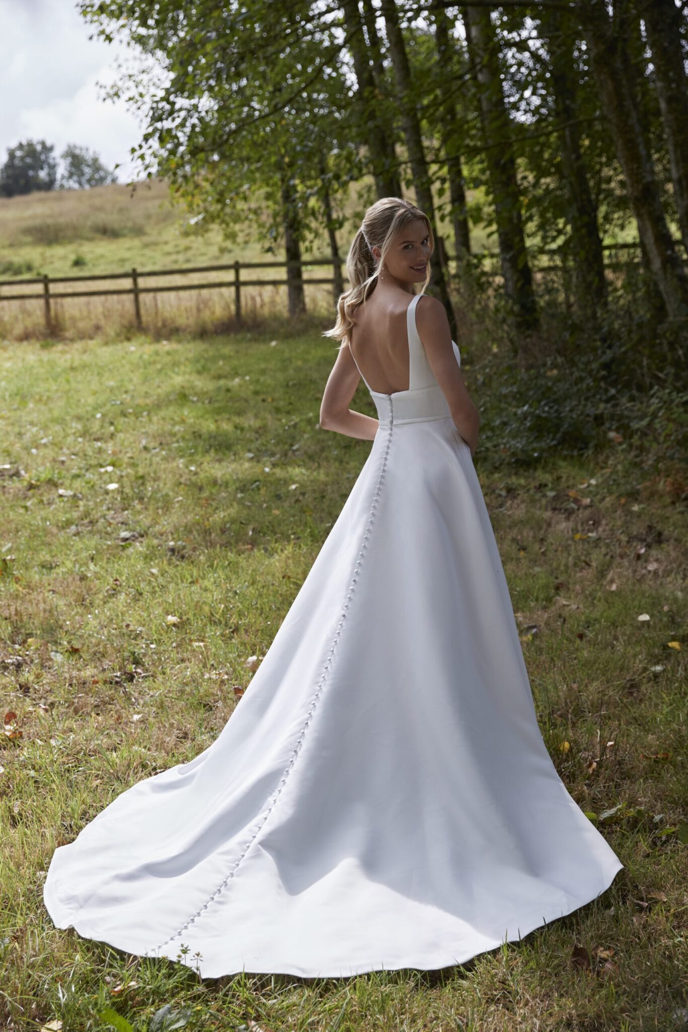 Yasmin – Simple, elegant, and effortlessly timeless, this gown is designed for the bride who loves clean lines and understated sophistication. A square neckline and defined waistband beautifully flatter the figure, while the flowing A-line skirt moves gracefully with every step. Decorative buttons trail down the back to the end of the train, adding a touch of classic detail. For added versatility, the gown comes with a detachable accessory that can be worn as either a dramatic cape or an additional skirt, allowing the bride to transform her look from ceremony to celebration with ease.